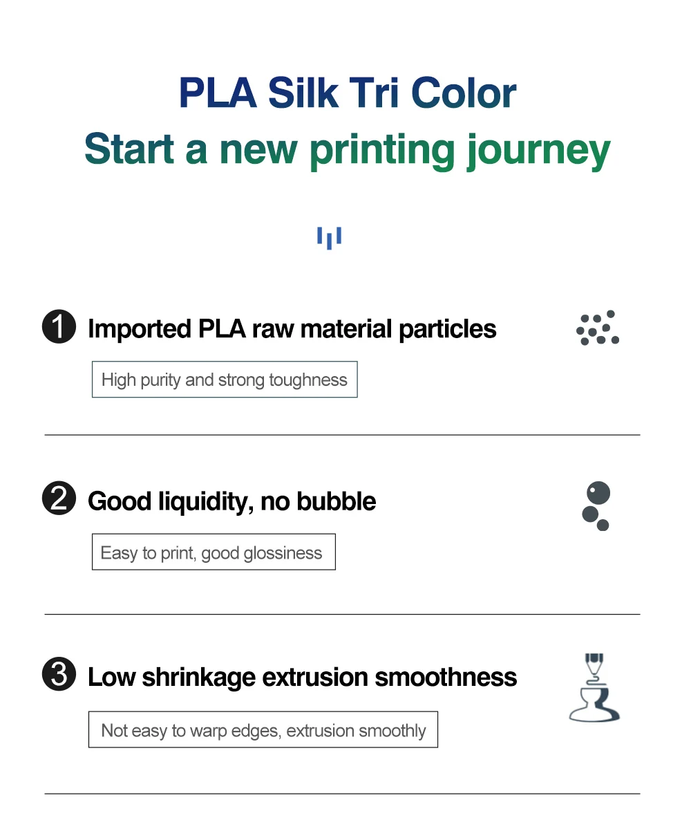 | Name | 200G TPU Tricolor PLA dual color Silk pla 3D Printer Filament 3D Printing Plastic Material 1.75mm Spool No Bubble Multicolor remove | Hotend For Bambu Lab p1p X1C P1S X1 P1P Upgrade Hot end Print Head 3D printing parts For bambulab Hardened steel Nozzle remove | Tricolor Silk PLA 3D Printer Filament, 1.75mm Multicolor 3D Printing Filament, Purple&Sky Blue&Yellow Filament, 250g (0.55lbs) remove | For Bambu Lab CMYK LED Backlight Board Bambu Lab PLA CMYK Lithophane Bundle 3D Print Lithophane Photo remove | Upgrade SV06 Plus Build Plate PEI Sheet for SV05/06/SV07 Plus 3D Printer Double Sided Textured PEI Flexible Steel Print Bed remove | JAYO 3D Printer PLA Classic Filament 1.75mm+/-0.02mm 300-600mm/s Print Range High Flow Speedy PLA 3D Printer Filament for 3D remove |