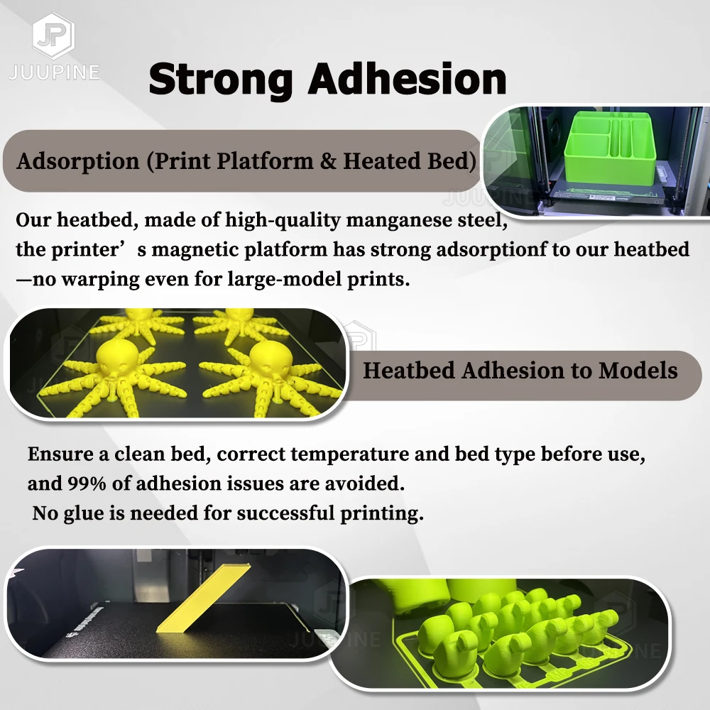 【Filament Compatibility】 It excels at printing PLA, PETG and other engineering materials, and is compatible with all materials with nozzle temperatures below 300℃. It performs much better in printing adhesion with most engineering materials than PEI build plates.