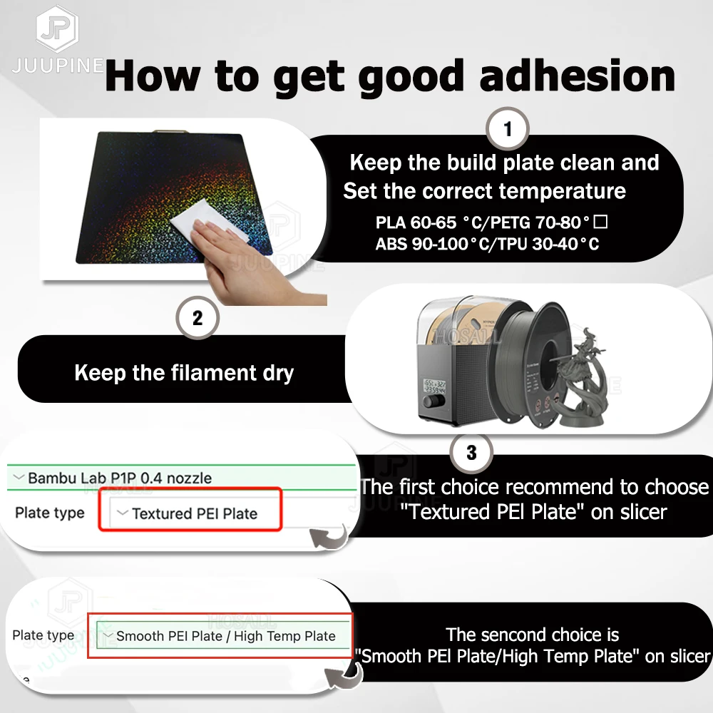 These low temperature stability 3d printer build plate adhesion highly surpasses traditional PEI steel spring sheets with PLA and PETG filament. Their superior first-layer adhesion help you to keep away from glue, edge warping and print falling off. We recommend a low temperature setting of 30-50℃ for PLA filament, 50-70℃ for PETG and 70-90℃ for ABS.