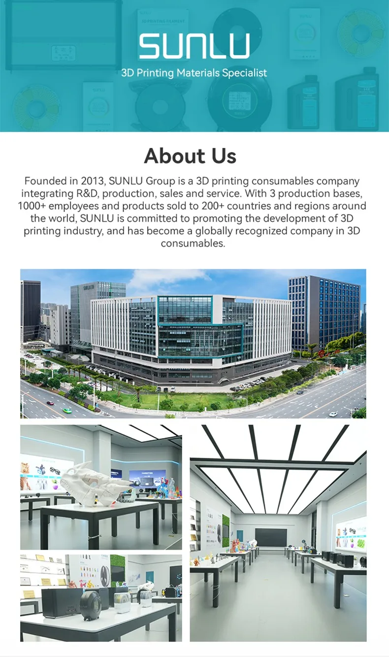 * SUNLU is a direct factory with ISO9001, SGS, TUV proved.