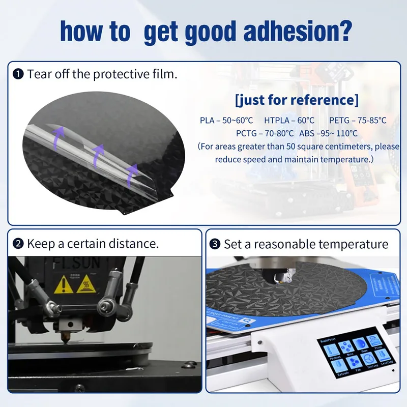 4.Textured PEI coating Surface is up to 300℃.print PLA/PLA+/PETG/ABS/TPU
