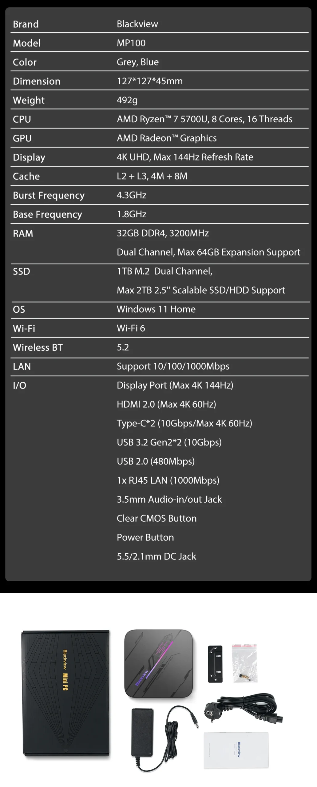 【Brand+】Blackview MP100 NEW Mini PC AMD R7 5700U/5825U Windows 11 8-Core 16-thread 16GB DDR4 512GB/1TB SSD WiFi 6 Mini