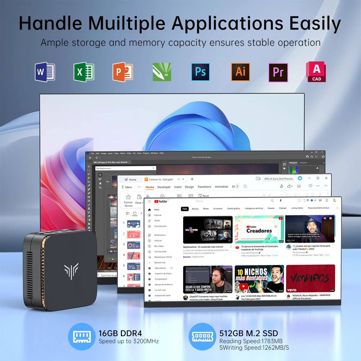 This device lets you handle multiple applications easily, thanks to ample storage and memory capacity. With 16GB DDR4 RAM (speed up to 3200MHz) and a 512GB M.2 SSD (reading speed 1783MB/S, writing speed 1262MB/S), it ensures stable operation even when running multiple programs like office software, design tools, or media apps simultaneously. Boost your productivity with seamless multitasking.