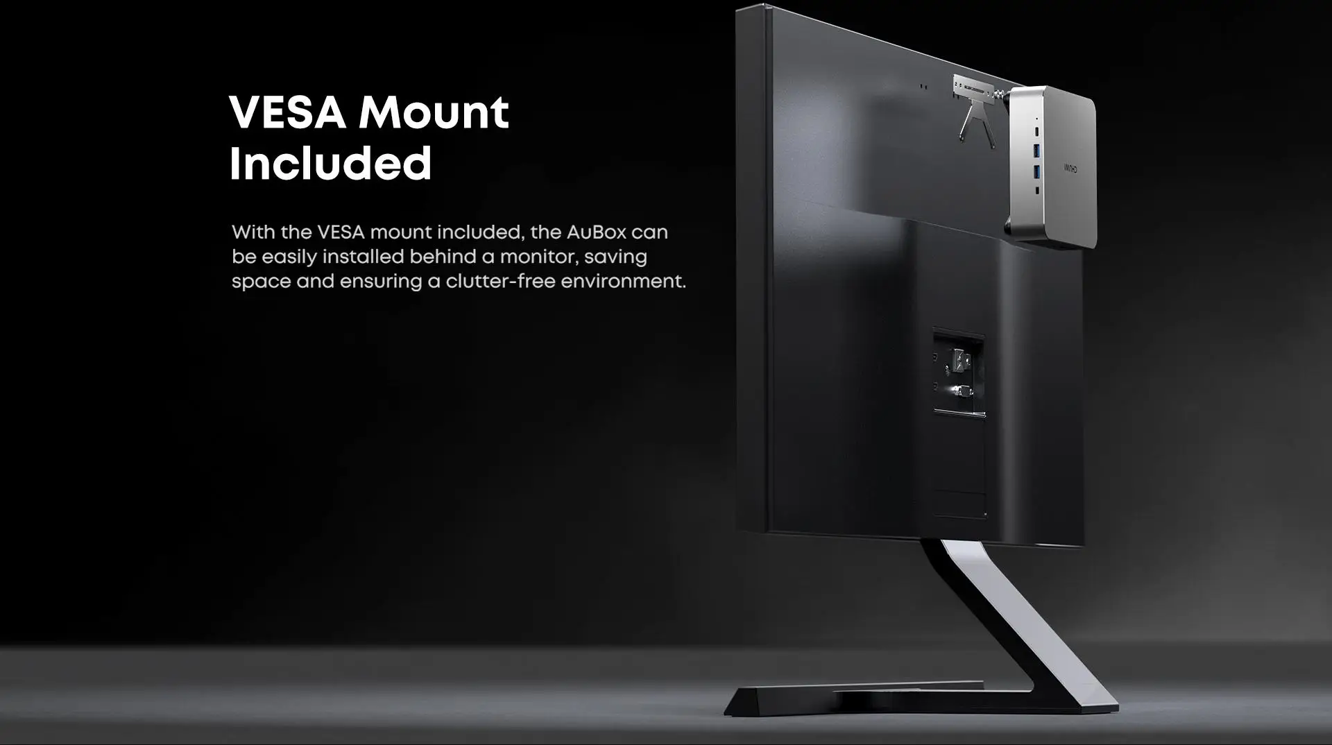 With the VESA mount included, the AuBox canbe easilyinstalled behind a monitor, savingspace and ensuring a clutter-free environment.