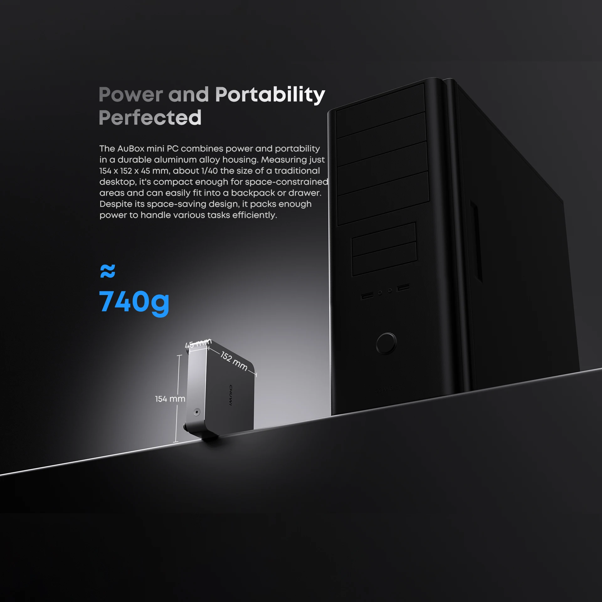The AuBox mini PC combines power and portabilityin a durable aluminum alloy housing. Measuring just154x152 x45 mm, about 1/40 the size of a traditionaldesktop, it's compact enough for space-constrainedareas and can easily fit into a backpack or drawer.Despite its space-saving design, it packs enoughpower to handle various tasks efficiently.
