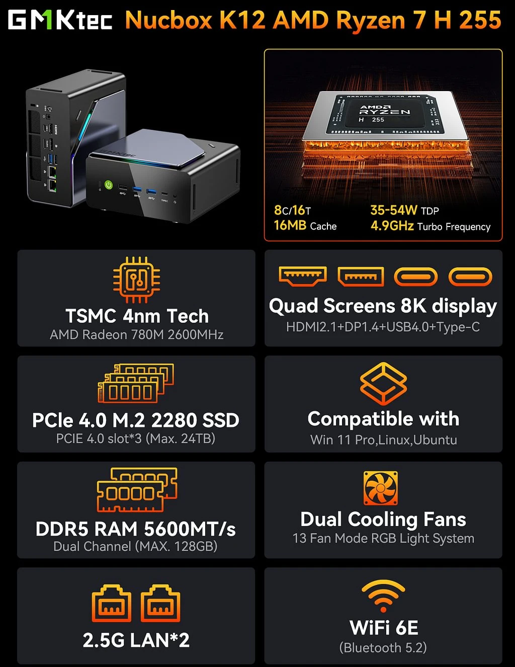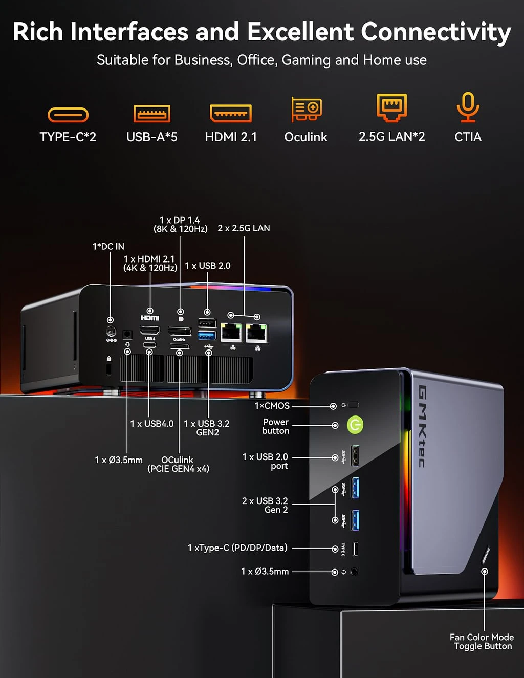 GMKtec K12 Mini PC equipped with 1 x Gigabit Ethernet LAN(RJ-45, supporting Gigabit file transfer speeds), 3 x USB3.2(10Gbps), 3.5mm Audio Jack, 1 x HDMI 2.1 Port and so on, plenty ports for connectivity simultaneous multi-program,balance your work and gaming needs.