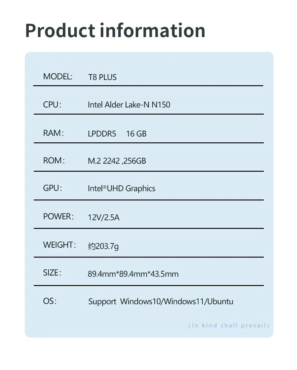 | Name | SZBOX T8 Plus Twin Lake N150 MINI PC Windows 11 Pro LPDDR5 8GB/16GB 512GB SSD WIFI5 BT4.2 Desktop Office Gaming Computer remove | MLLSE G3 Mini PC Alder Lake N100 Windows 11 Pro Intel 12th DDR4 8/16GB RAM 256/512GB ROM WiFi 5 BT4.2 Desktop Computer Mini Pc remove | GMKtec Nucbox G9 MINI NAS New Mold Intel N150 MINI PC Windows 11 Pro LPDDR5 M.2 2280 SSD WIFI6 BT5.2 Dual Triple Screen remove | SZBOX Ryzen 7 6800H MINI PC Windows 11 Pro LPDDR5 6400Mhz 16GB M.2 NVME SSD WIFI6 BT5.2 PCIE3.0 USB4.0 Gaming Office Computer remove | SZBOX Mini PC Intel Alder Lake-N97/Twin Lake N150RGB Light WiFi6 4K Dual Display/Dual LAN DDR4 3200MHz SSD NVMe/NGFF LCD Display remove | ACEMAGIC Intel N150/N95 Mini Host 11 Pro Desktop 4K Dual Display RAM 16GB SSD 512GB/1TB3.6GHz Suitable for Home/Office MiniPC remove |