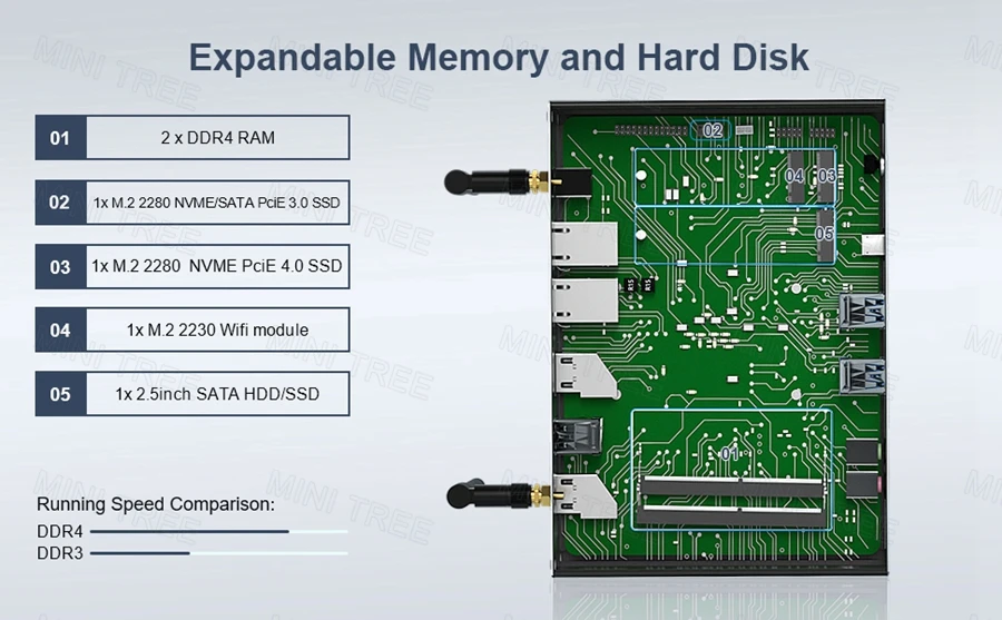 SSD:1xM.22280NVME/PCIE4.0x4(5000-7000MB/S), 1xM.2 2280 NVME/PCIE3.0x1/sata