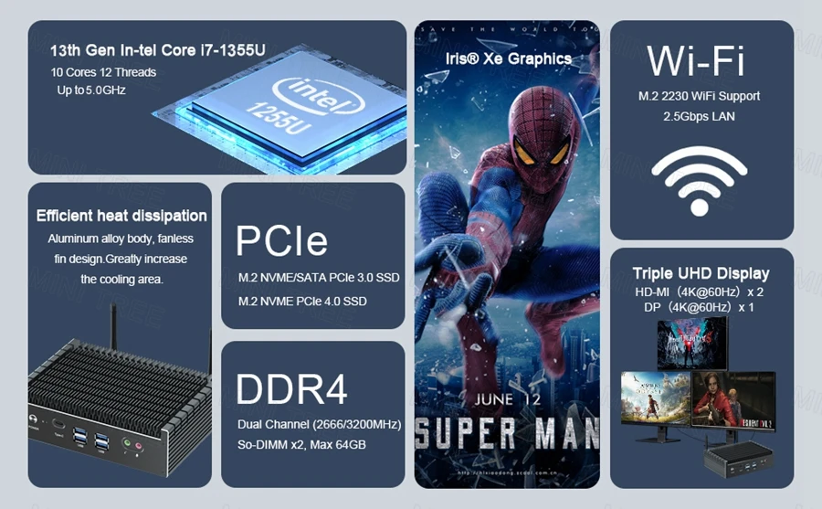 Yohirs 13th Gen Fanless Mini Pc Case Core i5 1335U 1355U Iris Xe Graphics 12M Cache Windows11 HDMI2.0 AX210 WIFI6 Game Computer