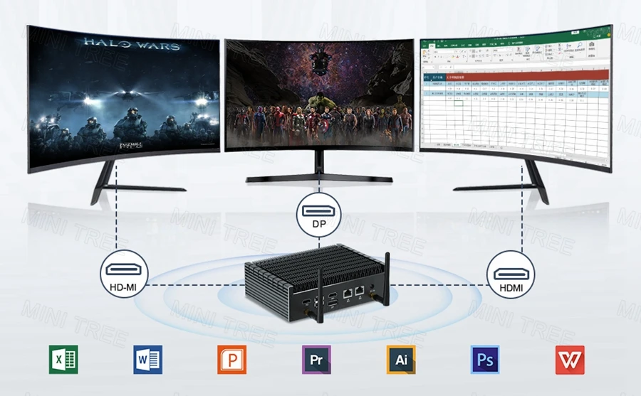 Rear I/O: 2 x USB 2.0, 2 x HDMI2.0, 1 x DP1.4, 2 x RJ45 LAN, 1 x DC-IN