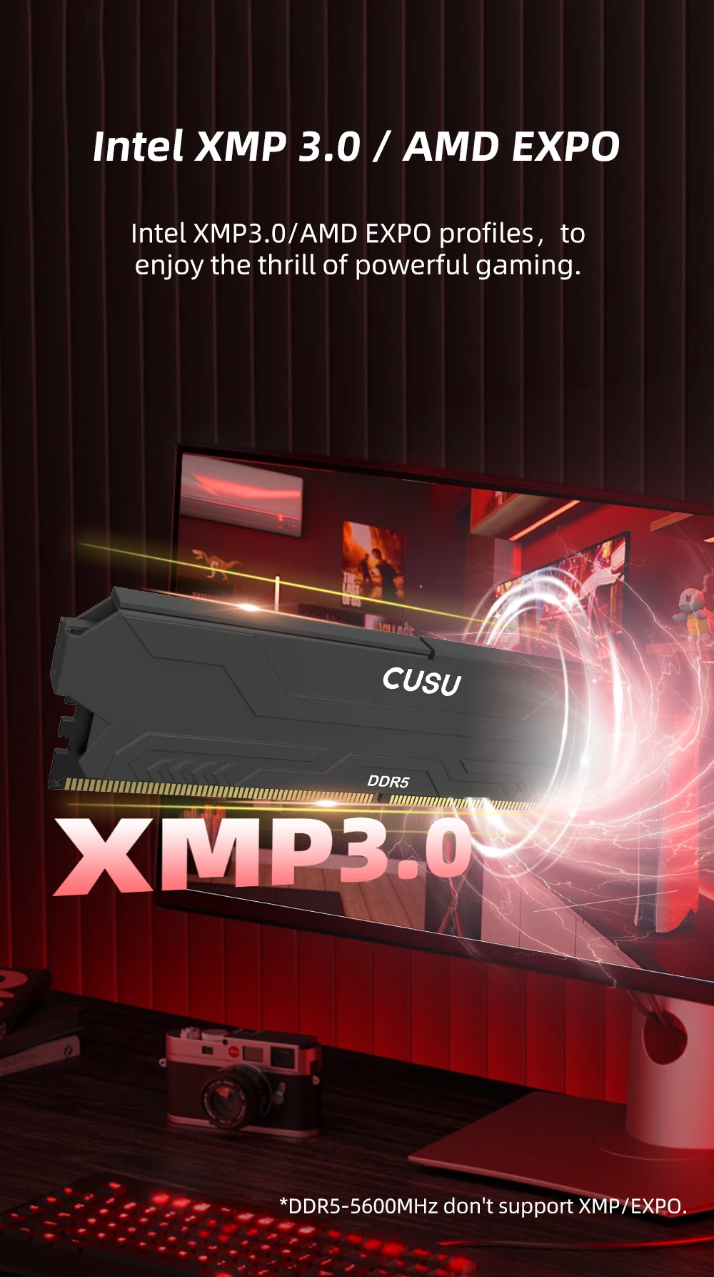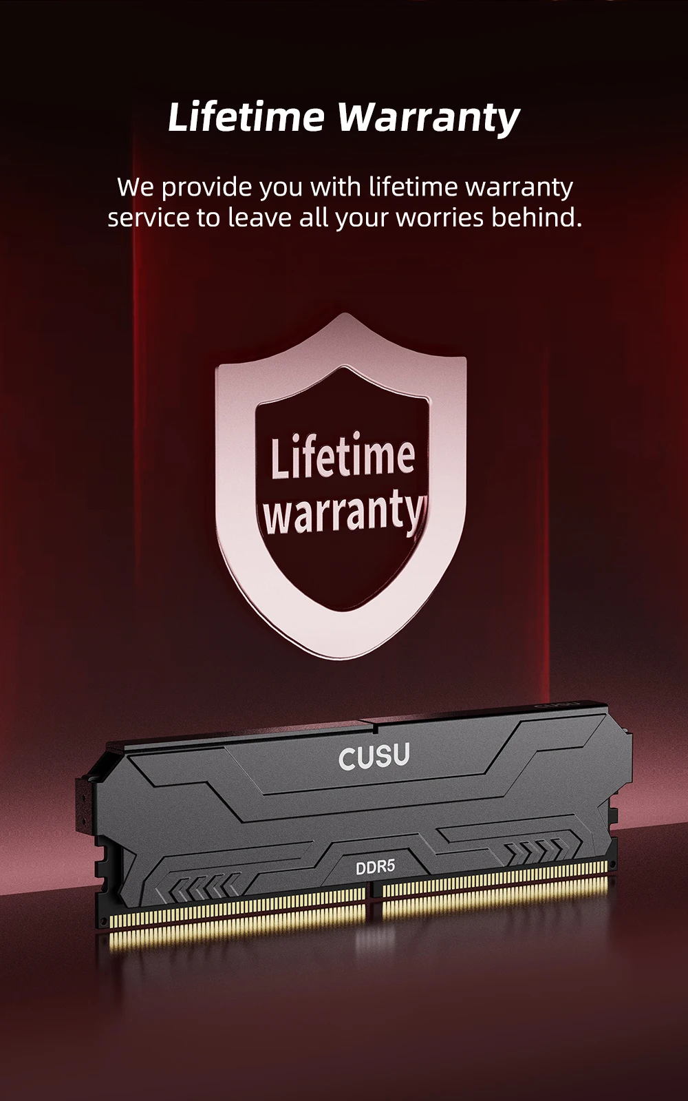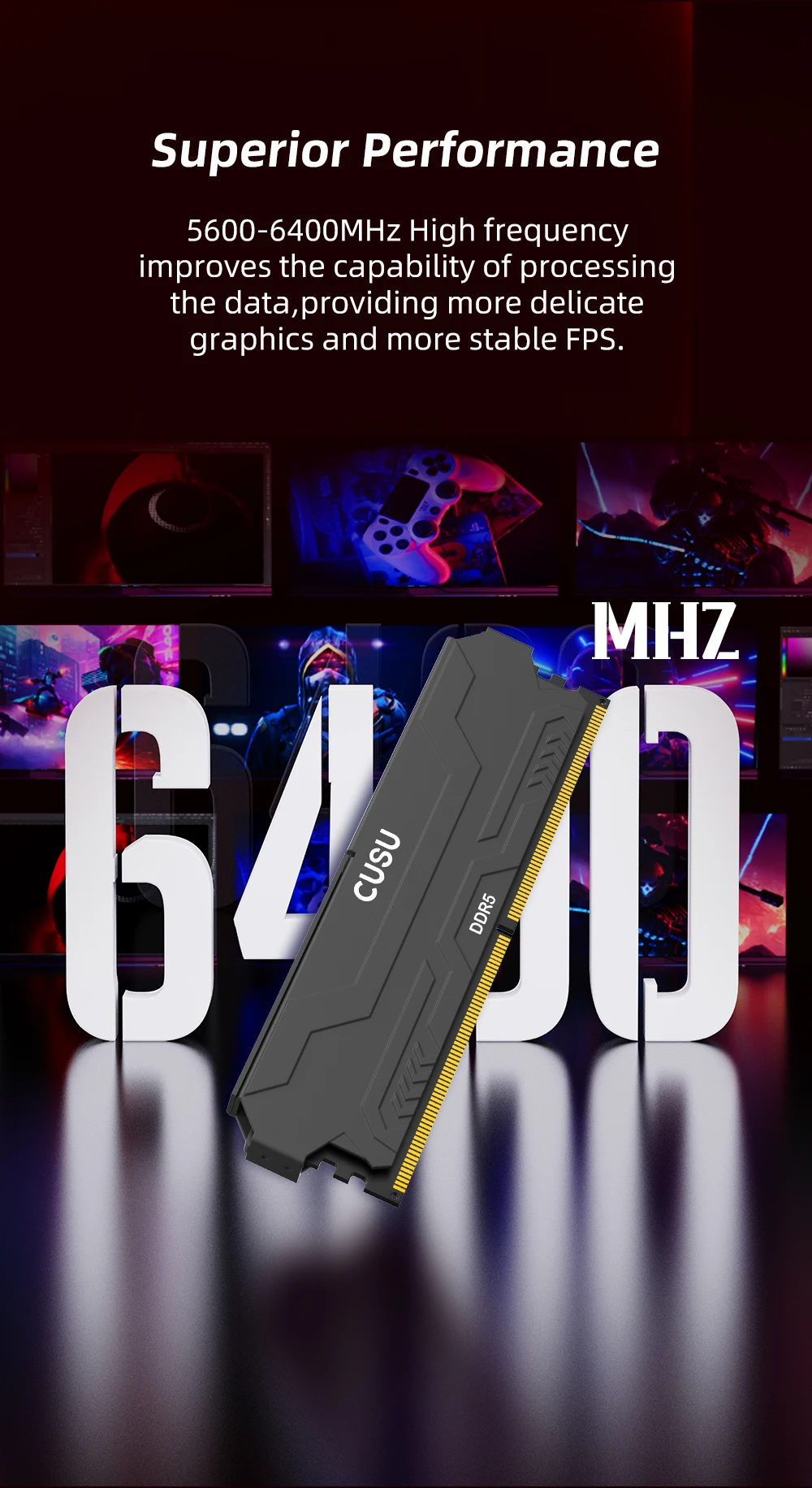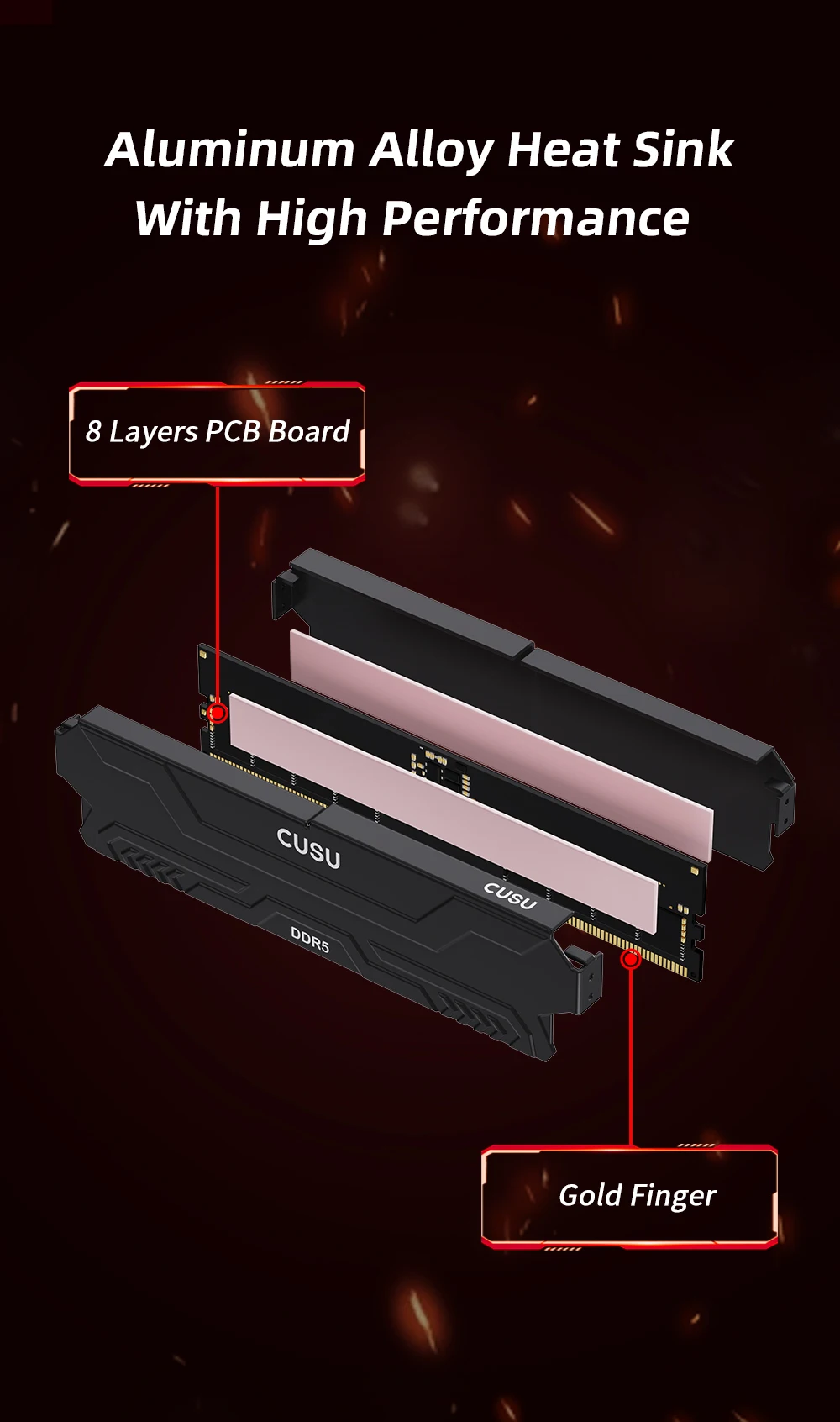 CUSU Black Heatsink DDR5 gaming memory can run up to 6000MT/s. Each 288-pin DIMM is equipped with PMIC (Power Management IC) and ECC (Error Correcting Code), featuring a more stable performance and high-speed operation. Armored with aluminum alloy heatsink, the memory modules function with better heat dissipation. With selected originally produced IC and other parts, they have undergone rigorous tests on compatibility, reliability and overall performance.