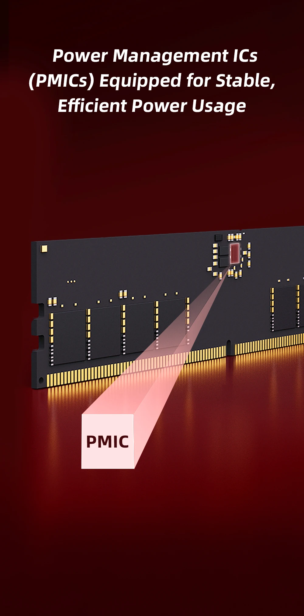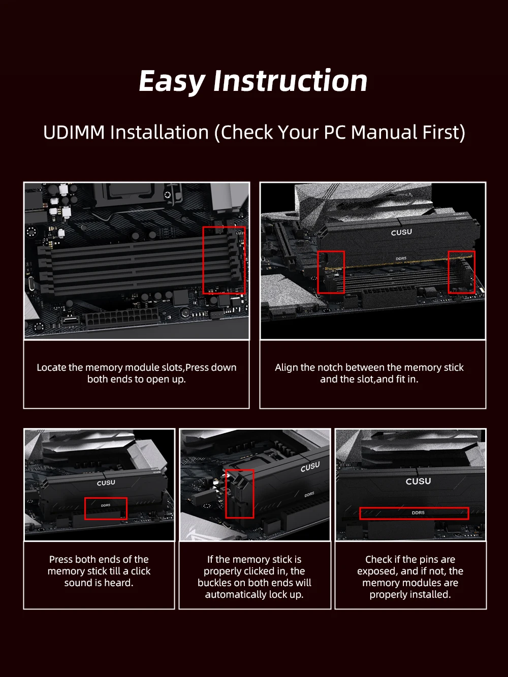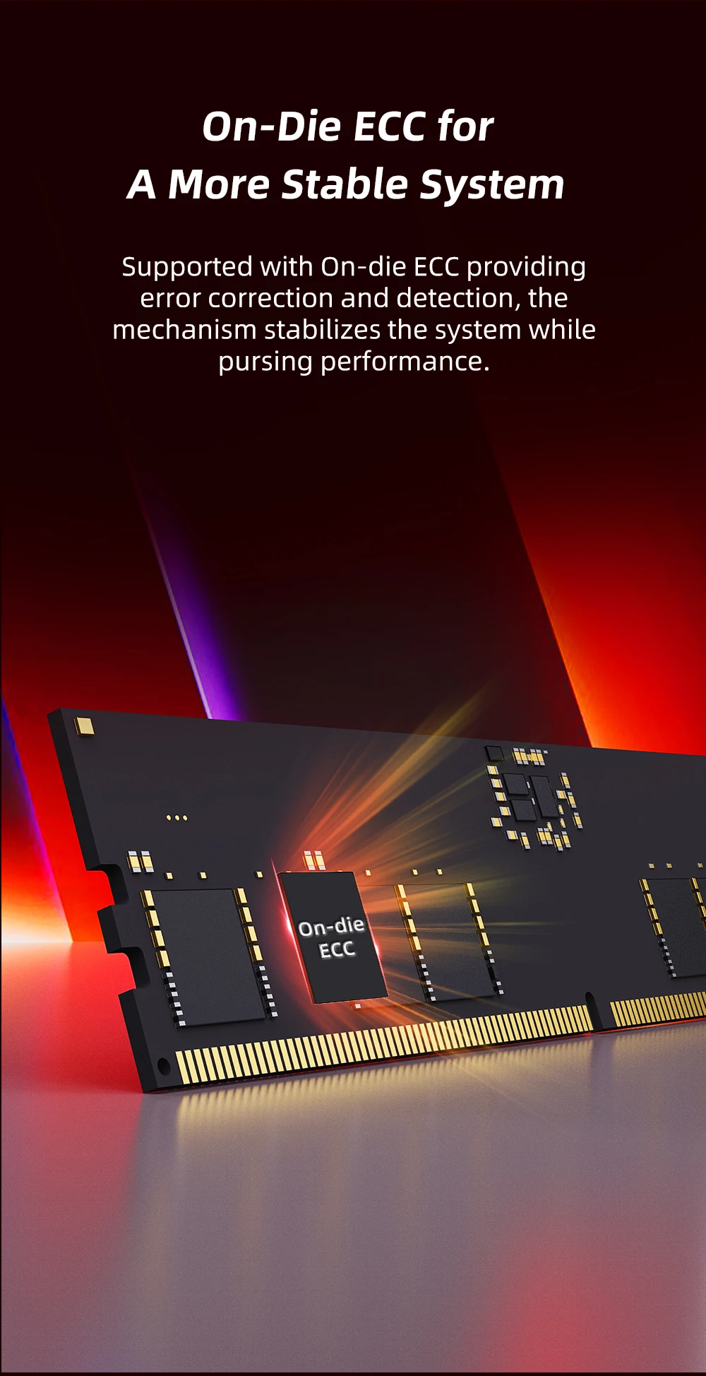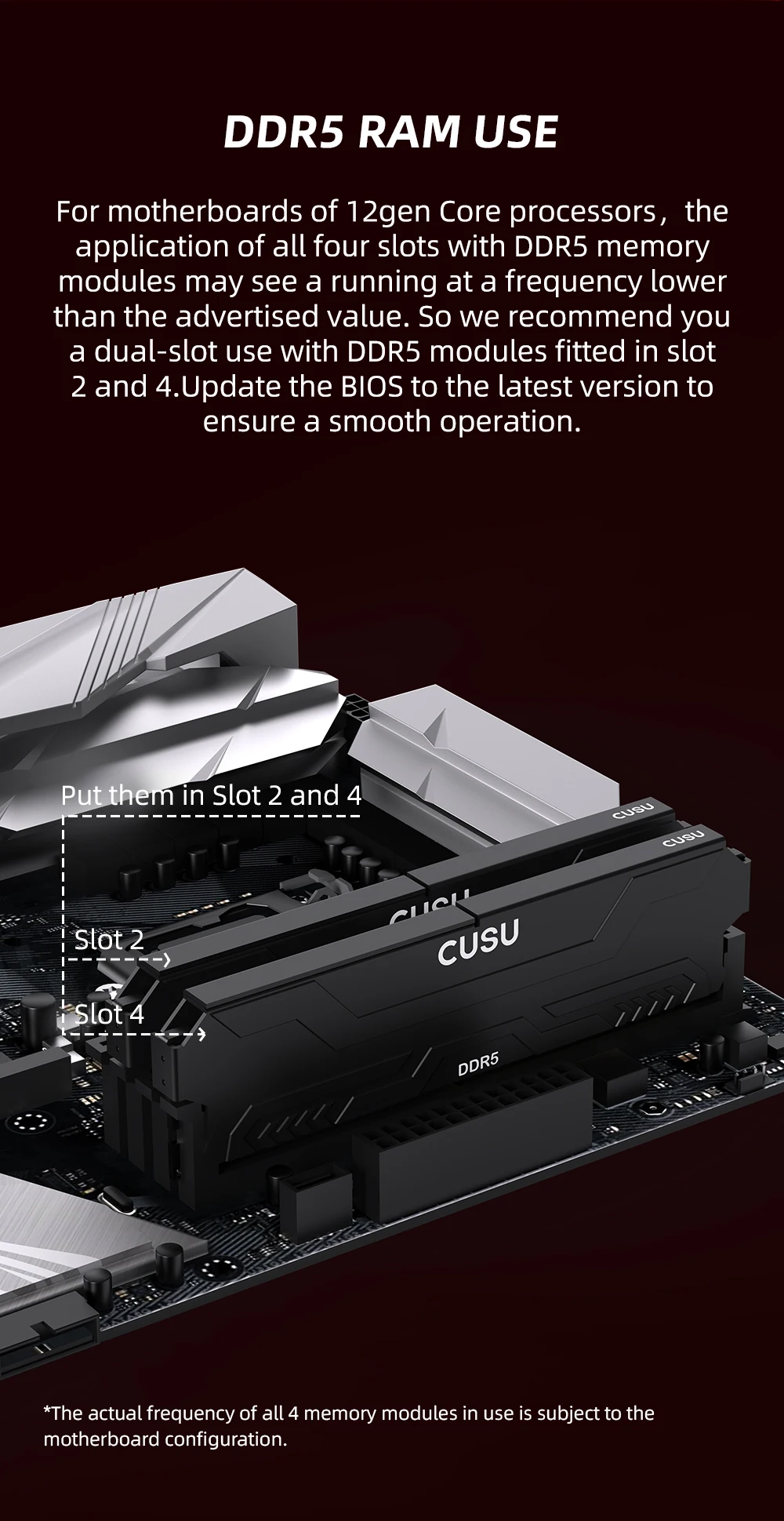 CUSU Black Heatsink DDR5 gaming memory can run up to 6000MT/s. Each 288-pin DIMM is equipped with PMIC (Power Management IC) and ECC (Error Correcting Code), featuring a more stable performance and high-speed operation. Armored with aluminum alloy heatsink, the memory modules function with better heat dissipation. With selected originally produced IC and other parts, they have undergone rigorous tests on compatibility, reliability and overall performance.