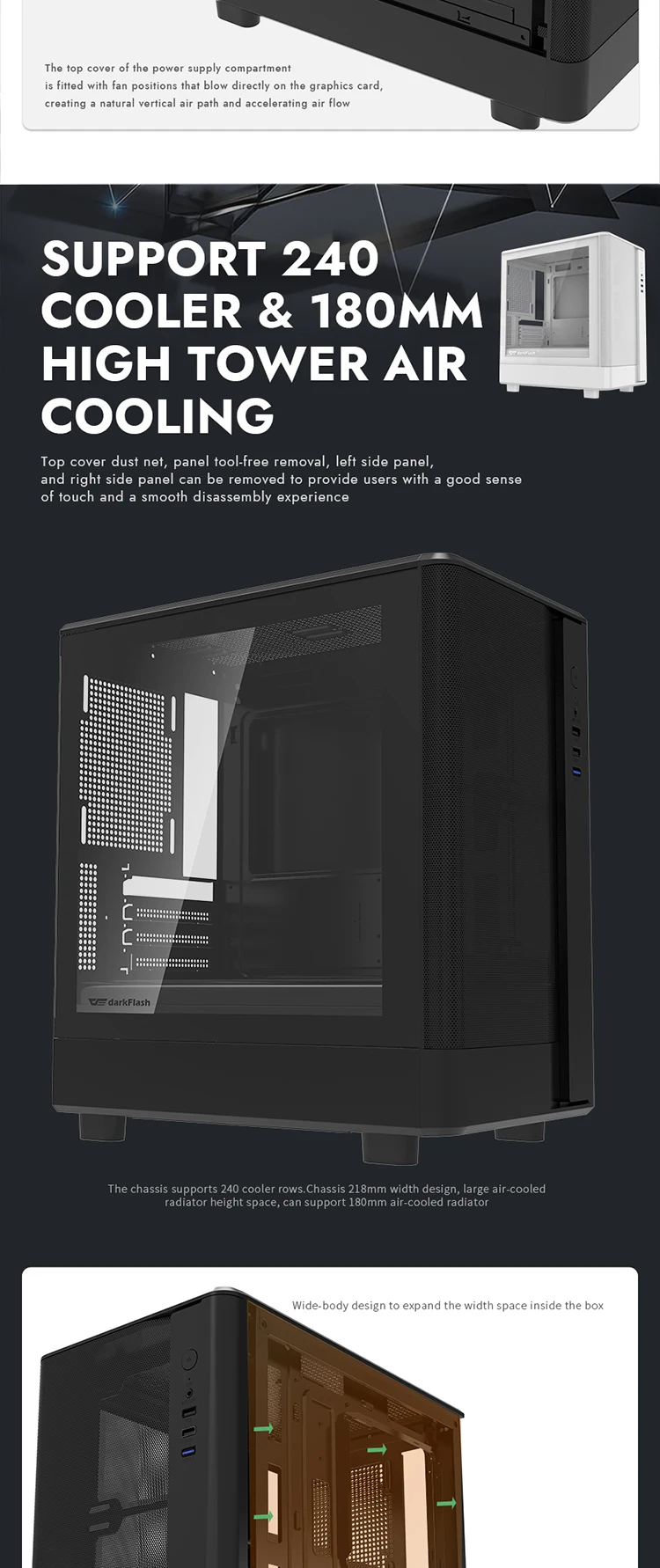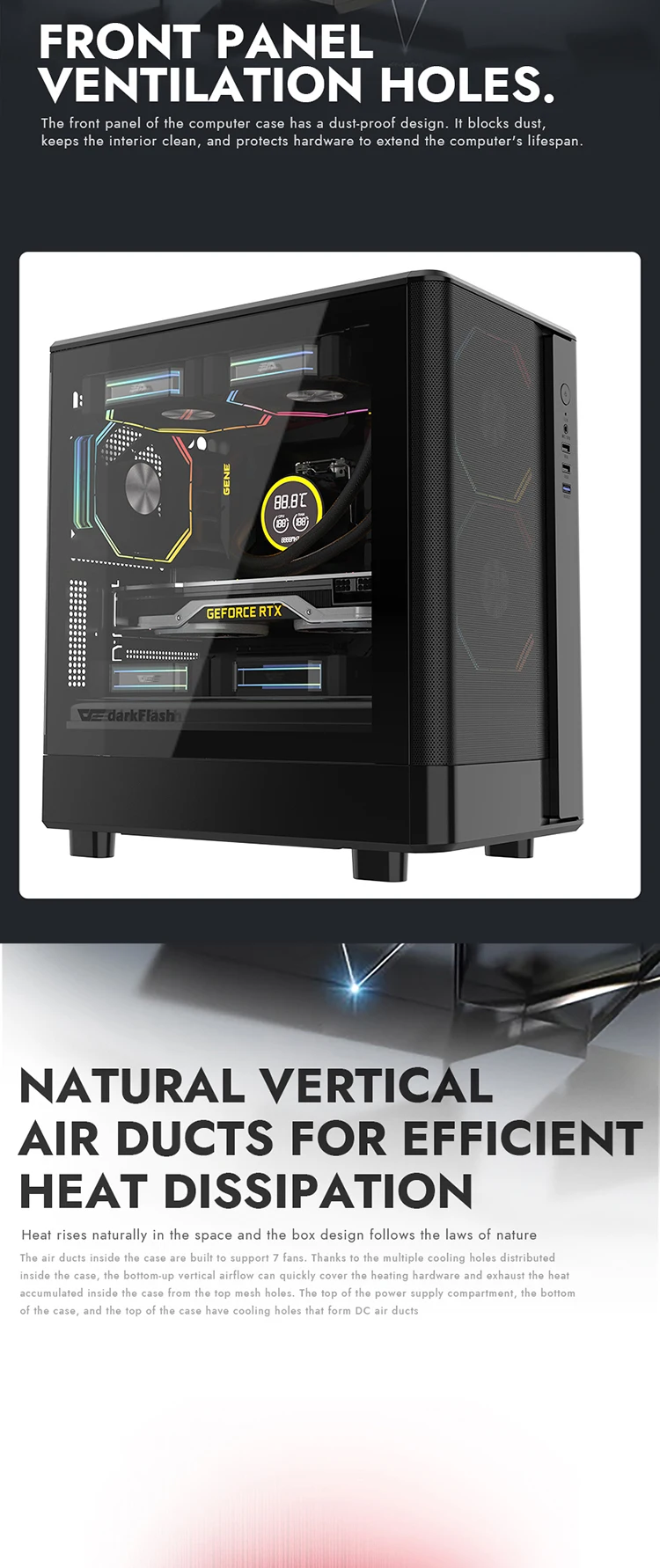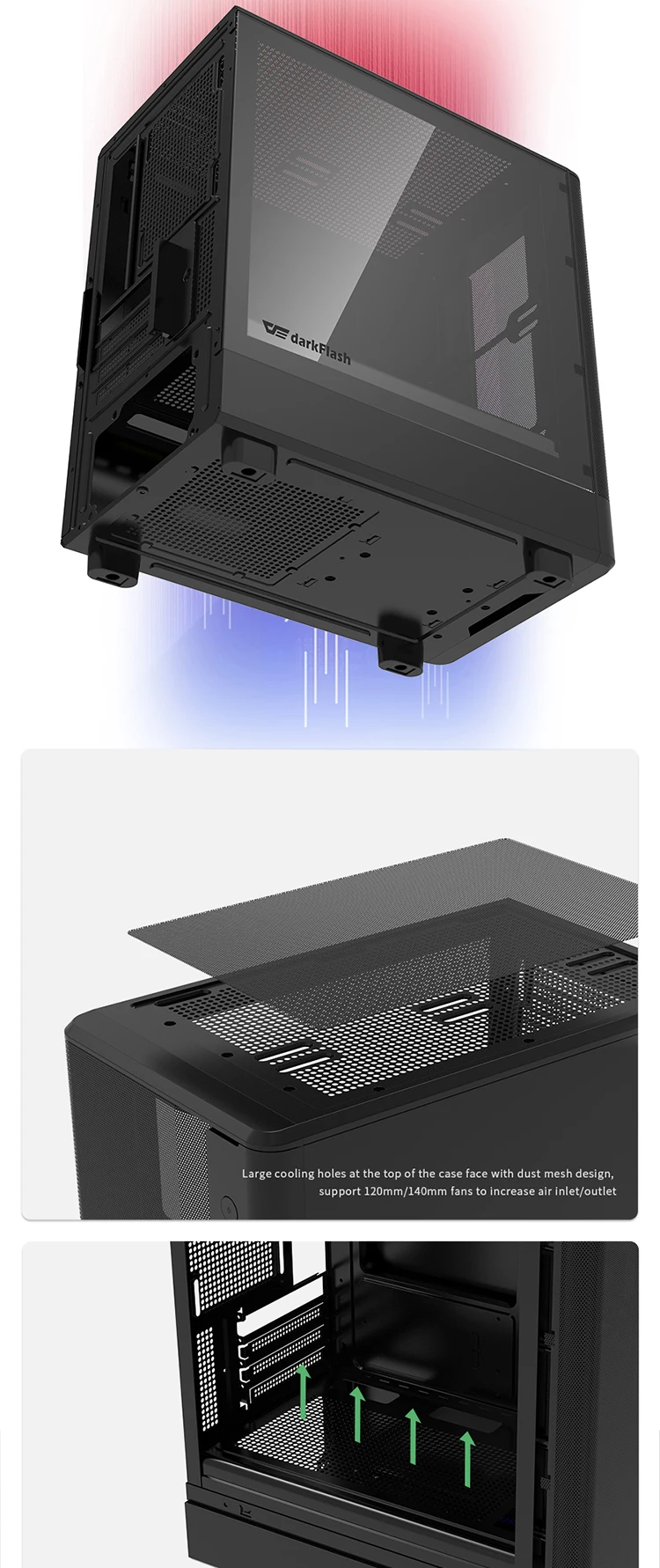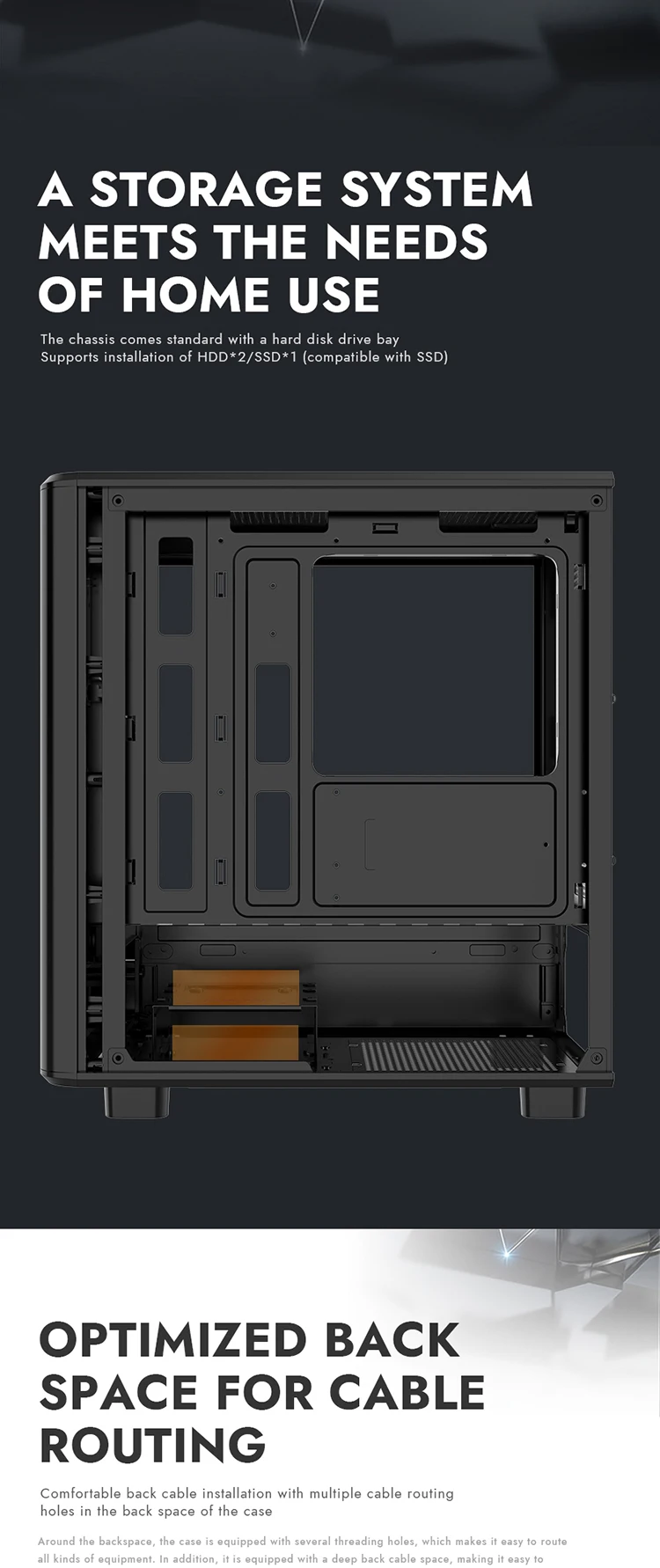 (1) The front panel uses a cool grid design, which effectively improves the air flow circulation in the chassis and increases the heat dissipation effect.
