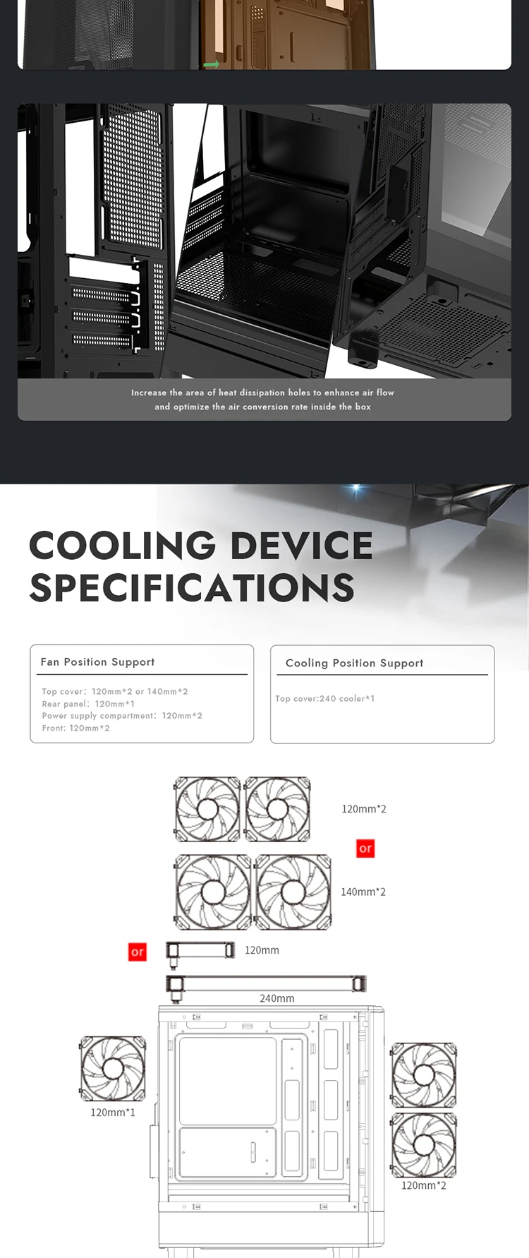 (3)Supports up to 120mm*7/140mm*2 fan sand 240mm radiator