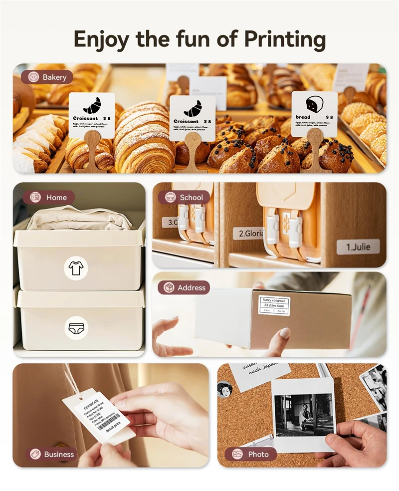 You can print product labels, address labels, ingredient labels, price labels, clothing labels, jewelry labels, etc. using functions such as text, pictures, QR codes, and barcodes.