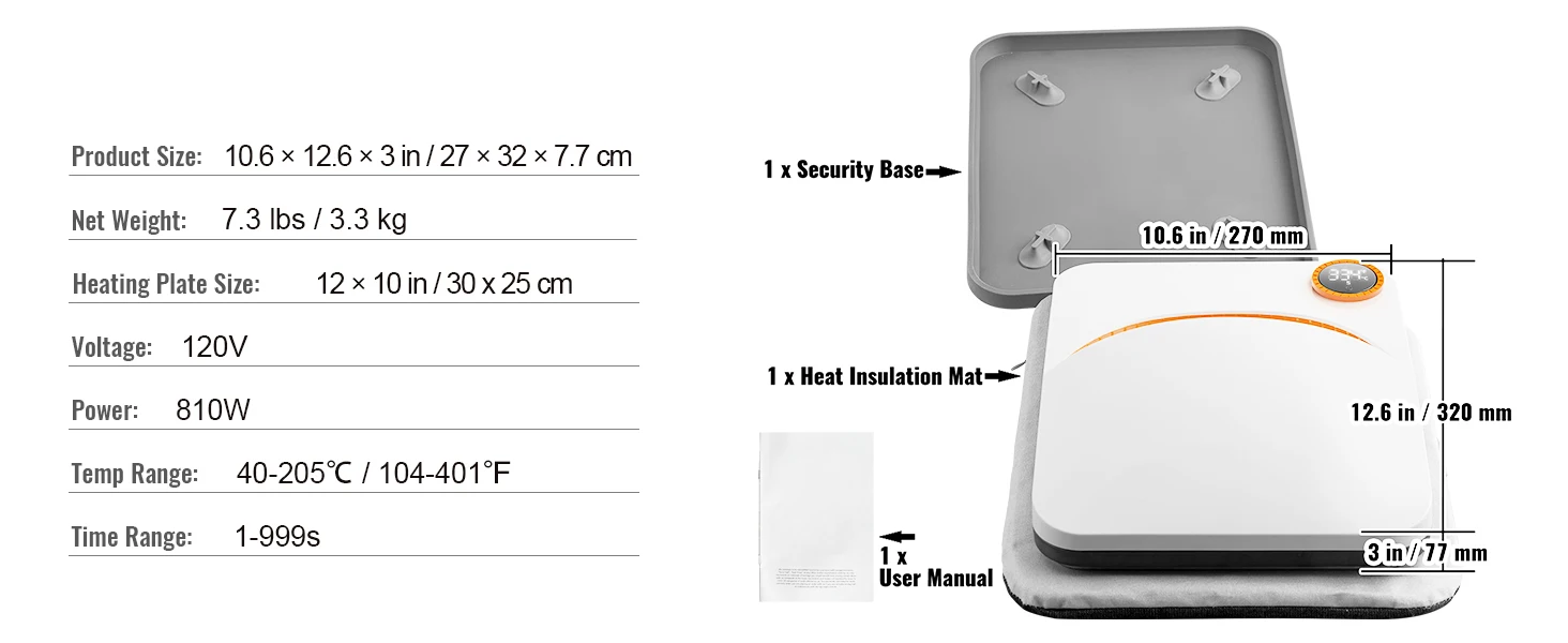 Small But Mighty: This power heat press from VEVOR is ready to create endless patterns on your t-shirts, canvas bags, coasters, pet collars, woodwork, baby blankets, etc. A thinner and lighter body reduces mass production fatigue and the burden of daily storage. Powerful things don't always have to be big.