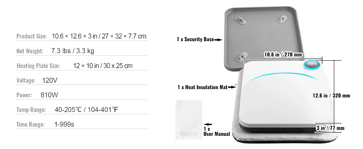 Do more: Are you ready for options? Get ready to get the most from your heat press! This machine can be used for ironing or heat transfer printing, which heats faster and more uniformly than the home iron. Equipped with a security base and heat insulation machine body to safeguard you at all times. Come on, pick up any clothes next to you, and give it a try!